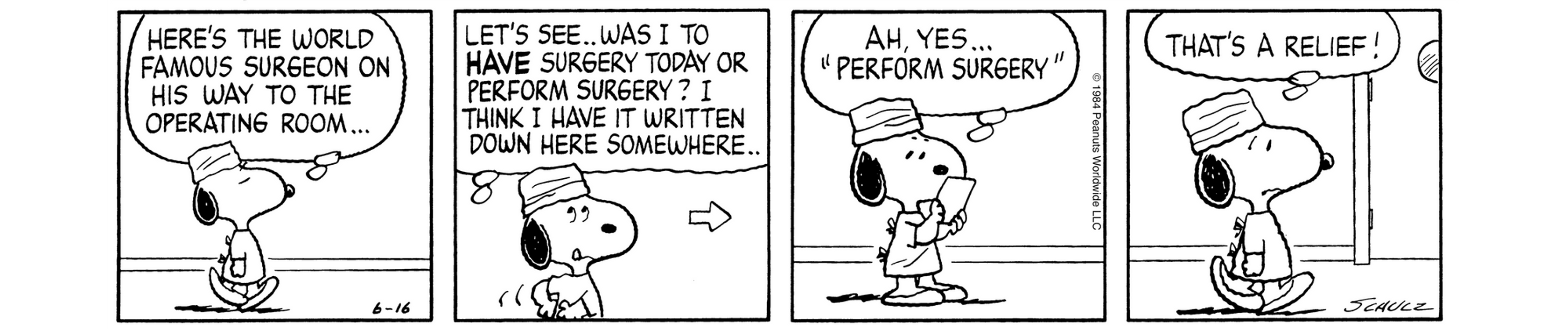 As the World-Famous Surgeon, another of his alter egos, Snoopy wanders the halls of the hospital in his surgical cap and gown. Though he’s not tall enough to perform actual surgery, he’s always ready to hand out medical advice. Like, if you can’t eat pasta before jogging, try a Boston Cream Pie. He’s proud of his profession, but wishes the nurses respected him a little bit more. And, he does acknowledge it’s difficult to make house calls when you’re not allowed in the house.